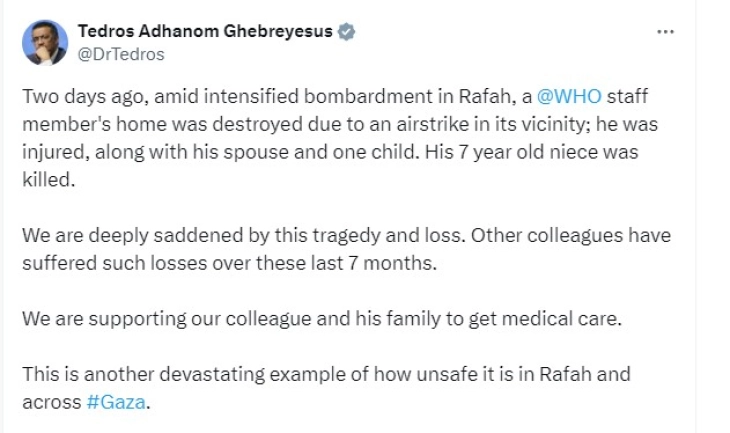 Шефот на СЗО, Тедрос Аданом Гебрејесус, соопшти дека еден припадник на персоналот на Светската здравствена организација (СЗО), неговата сопруга и едно дете биле ранети во воздушен напад во кој во средата била уништена нивната куќа во Рафа.