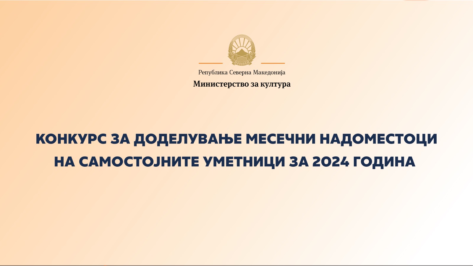 Министерството за култура преку Конкурсот за доделување на месечни надоместоци на самостојните уметници за 2024 година, објавен на 1 ноември, го стимулира и помага уметничкото творештво на самостојните уметници.