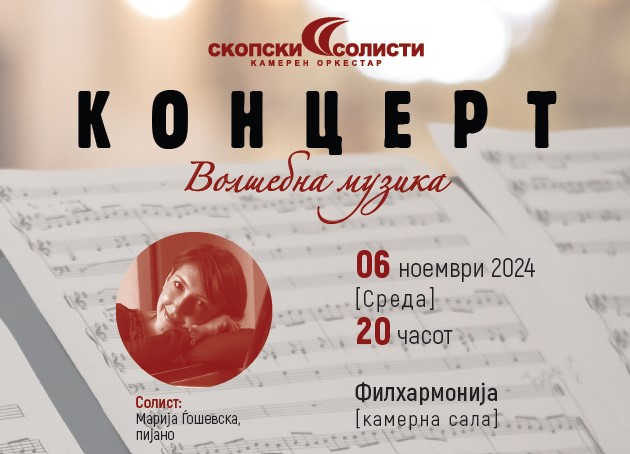 Камерниот оркестар „Скопски солисти“ вечер во камерната сала на Филхармонијата со почеток во 20:00 часот ќе одржи концерт со наслов „Волшебна музика“. Како солист со Камерниот оркестар ќе настапи пијанистката Марија Ѓошевска, а диригент ќе биде Бисера Чадловска.