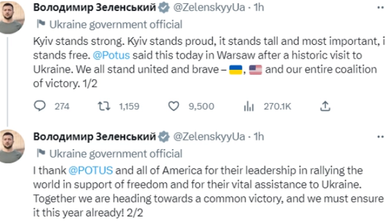 Во реакција на Твитер, Зеленски им се заблагодари на Бајден и Америка за „нивното лидерство во собирањето на светот за поддршка на слободата и за нивната клучна помош за Украина“.