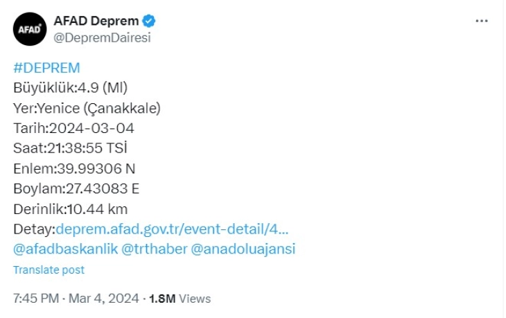 Турската агенција за управување со вонредни состојби (АФАД) соопшти дека земјотрес со јачина од 4,9 степени според Рихтеровата скала вечерва го погодил округот Јенице во провинцијата Чанаккале.