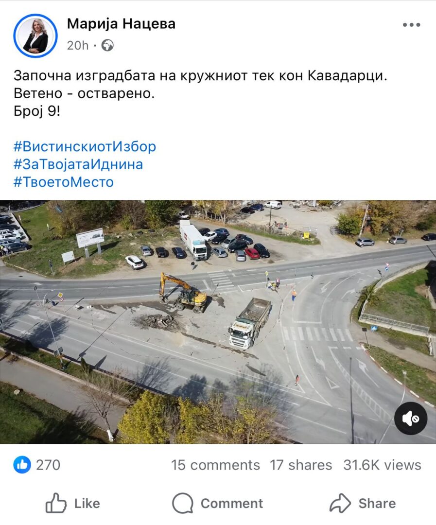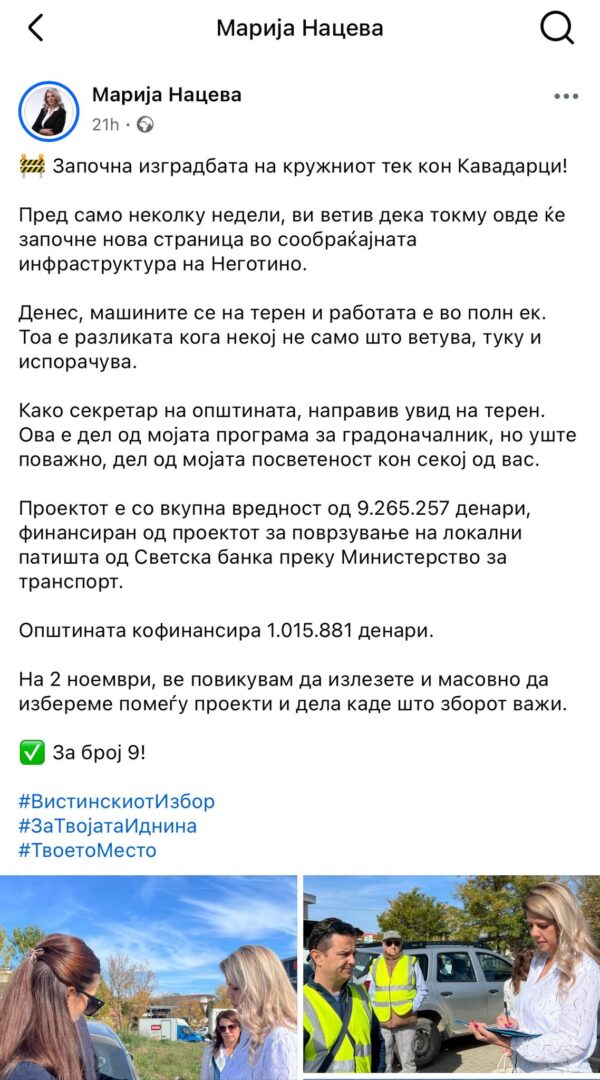 Кандидатката за градоначалник на Неготино, Марија Нацева, со статус дека „започна изградбата на кружниот тек кон Кавадарци“ го претвори општинскиот проект во кампањска бина. Настапувајќи истовремено како секретар на Општината и како кандидат, таа на терен прави „увид“, ја истакнува вредноста на проектот (9.265.257 денари, со општинско кофинансирање од 1.015.881 денари) и — најважно — на крај отворено повикува да се гласа „за број 9“ на 2 ноември. Токму оваа комбинација е учебнички пример за забранета и експлицитна злоупотреба: мешање службена позиција, јавни средства и механизација со партиска агитација.